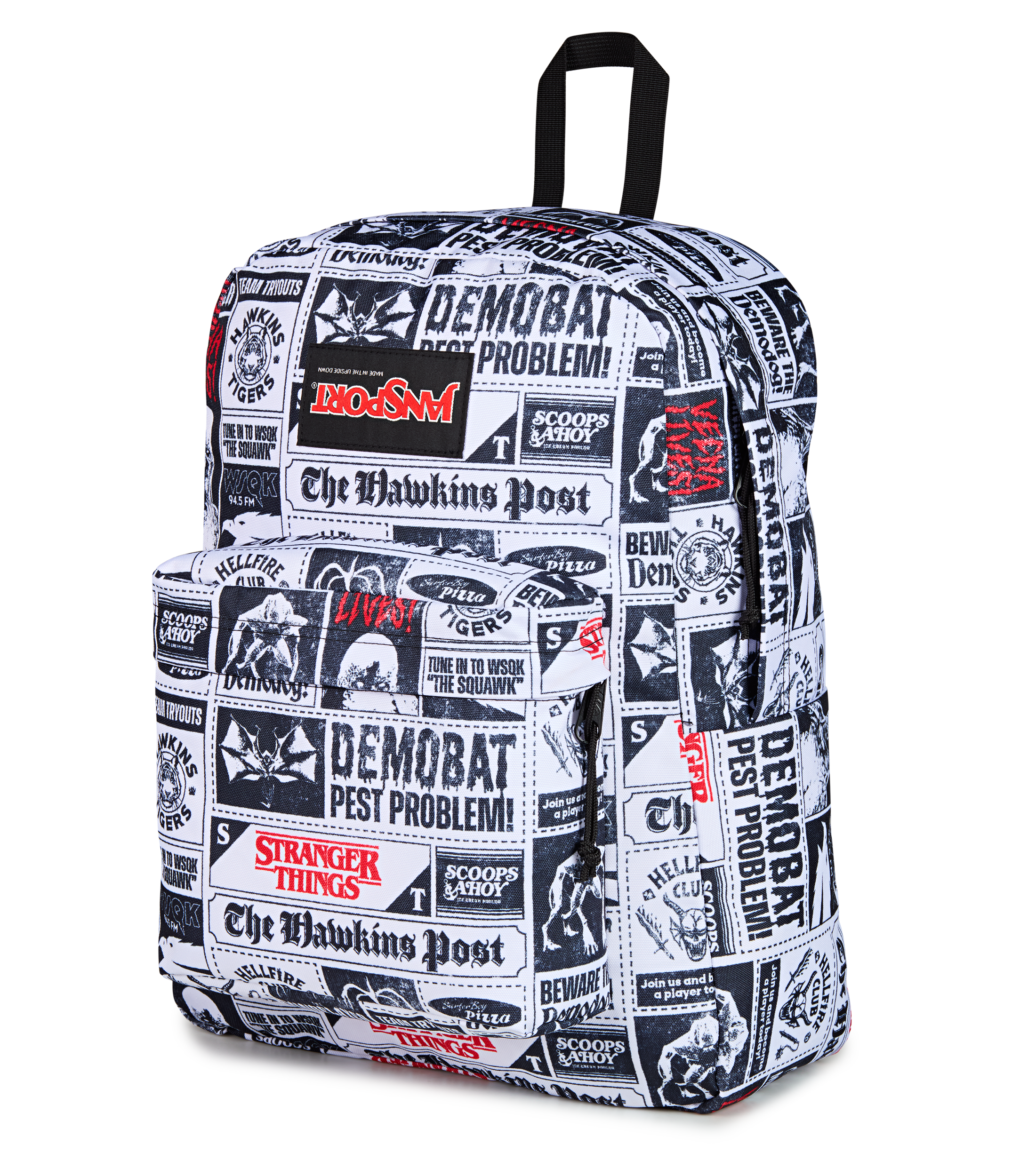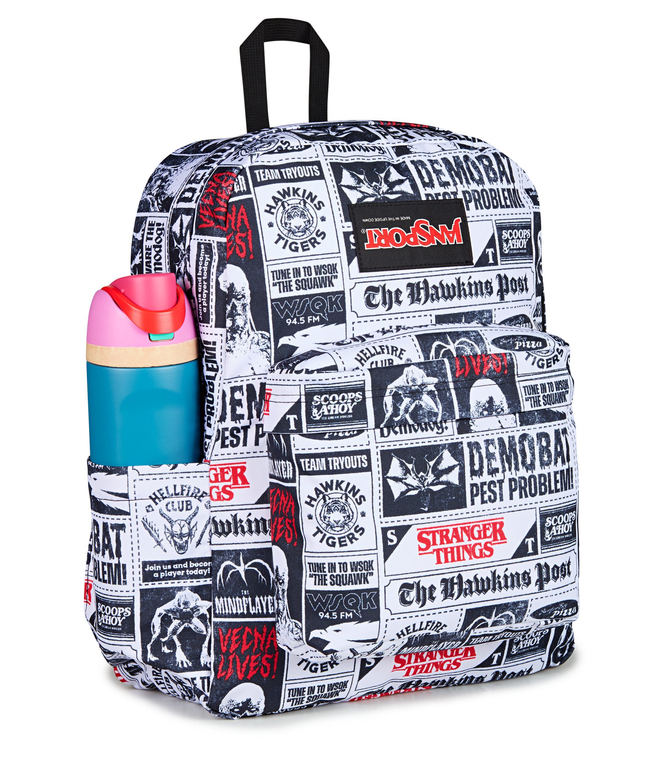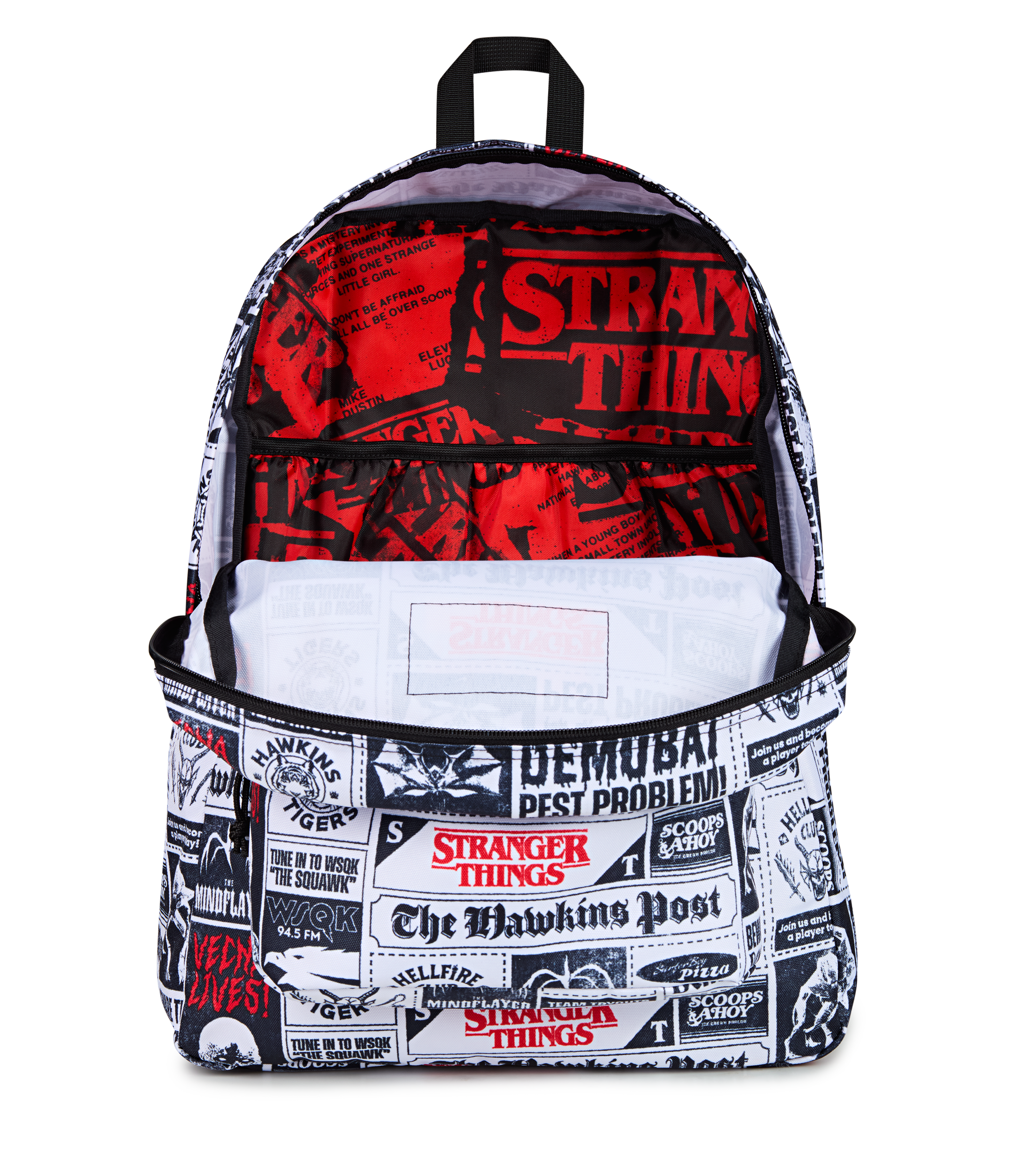 Photos develop. secrets surface. and this pack keeps it all covered. The SuperBreak Plus is your go-to for every headline-worthy mission. with a roomy main compartment. laptop sleeve. and organizer pocket for stashing the evidence. Whether you’re sleuthing through Hawkins or hiding in the darkroom. it’s built to hold your story together. Finished in a Hawkins Post-inspired print covered in ominous headlines. eerie snapshots. and new clippings that should’ve stayed buried.